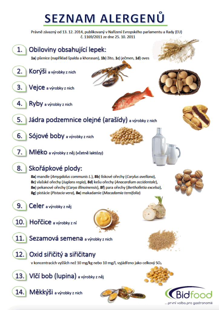 Seznam očíslovaných alergenů v bude vyvěšen na nástěnce ve školní jídelně, vždy vedle aktuálního jídelníčku a za každým vypsaným pokrmem v jídelníčku budou číselně označeny alergeny.